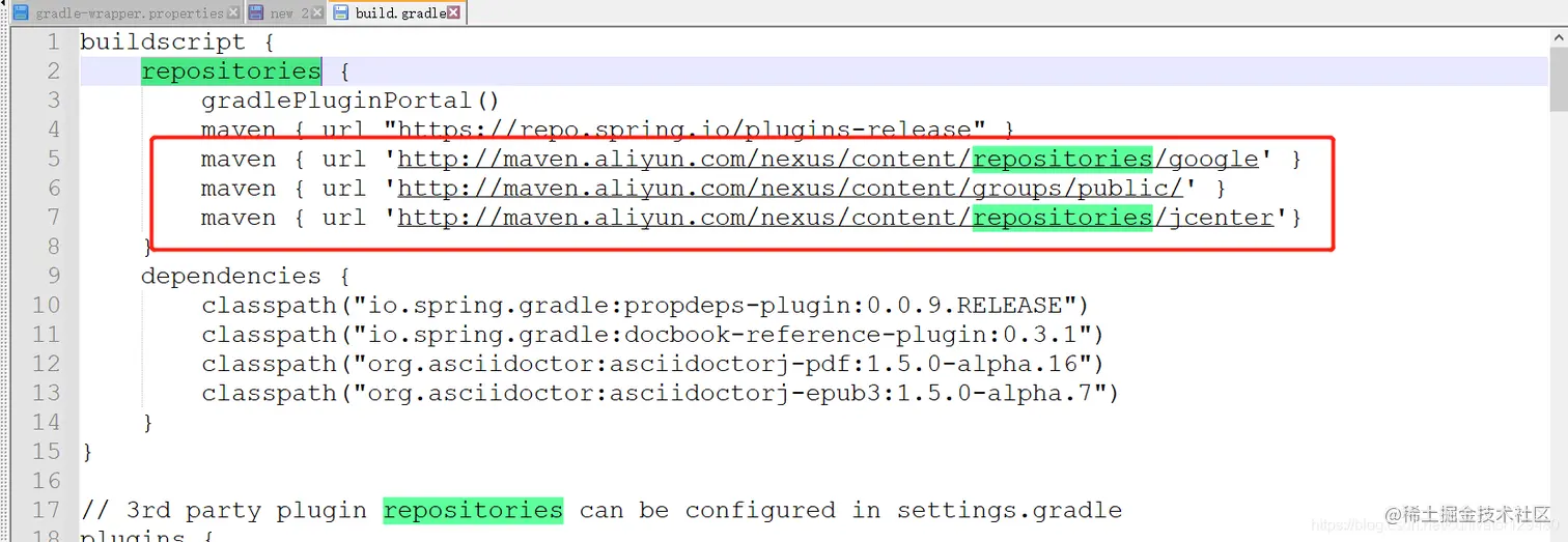 新增以下配置(没有以下配置,构建过程超级慢……),定义全局的国内镜像,注意该配置不能在plugins { }之前