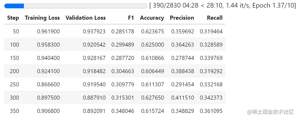 评估是每50步进行一次。我们可以通过改变TrainingArguments中的logging_steps参数来改变评估的间隔时间。除了默认的训练和验证损失指标外,我们还得到了额外的指标,这些指标是我们在前面的compute_metric函数中定义的。