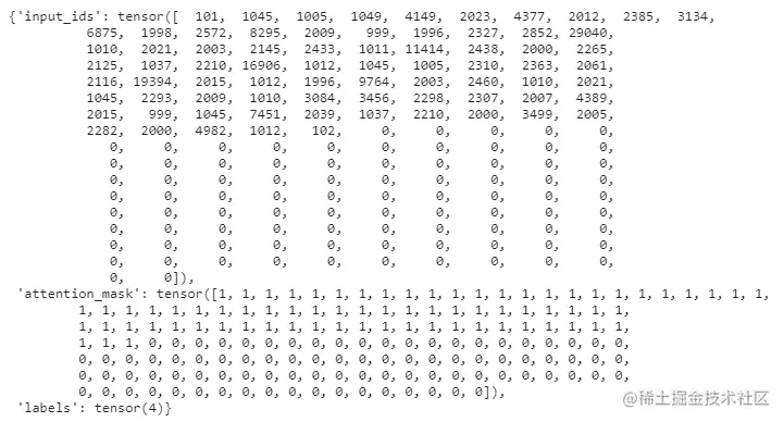 - input_ids:它包含一个整数张量,每个整数代表原句中的单词。标记化步骤已经将单个单词转化为由整数代表的标记。第一个标记101是句子的开始标记,102标记是句子的结束标记。请注意,有许多尾部的零,这是由于在标记化步骤中对句子进行了填充。