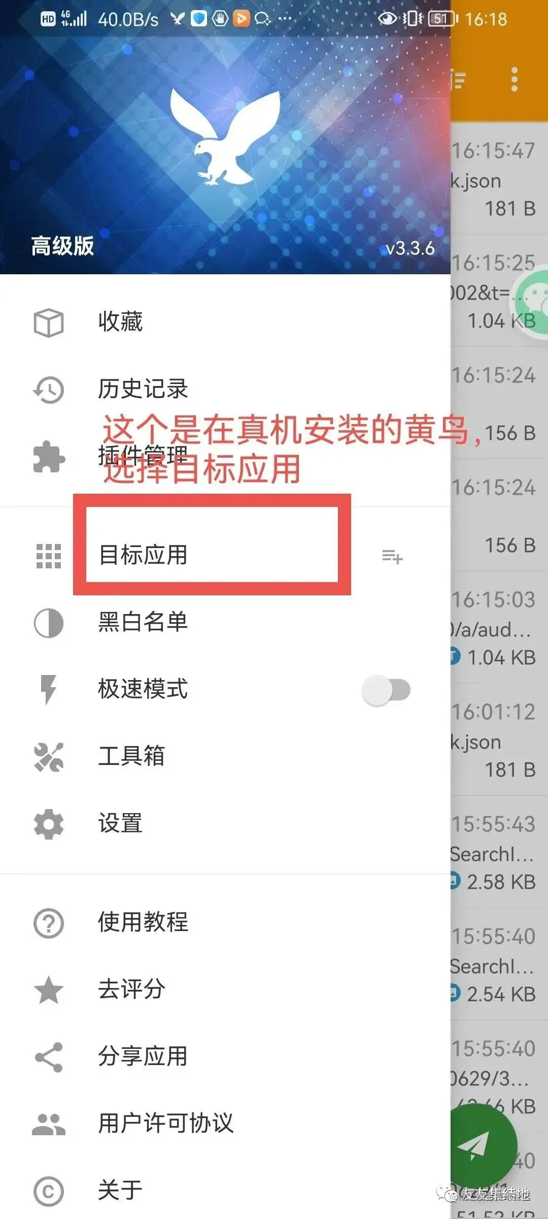 下面就是在真机安装的黄鸟,选择捉包应用