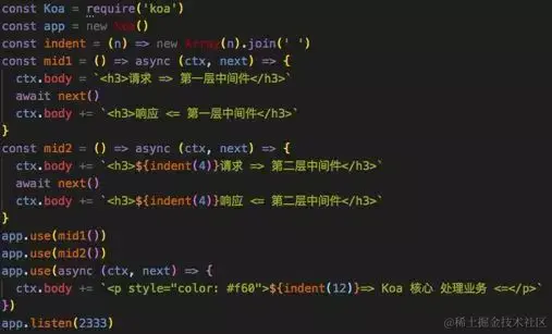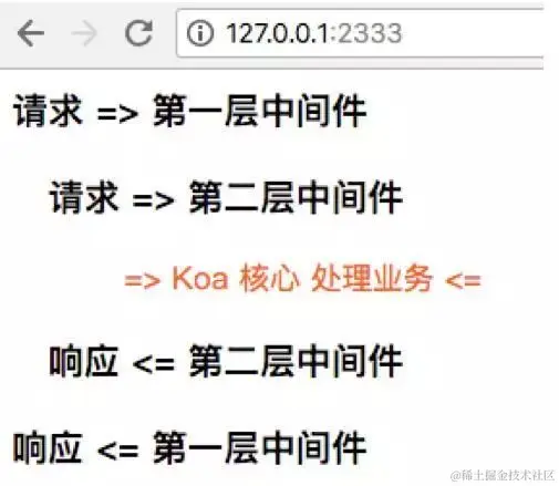 与express最大的不同点,就是中间件再也不是顺序执行,而是类似洋葱和堆栈,先进后出的流程,这样可以提供更好的流程控制,例如日志处理。