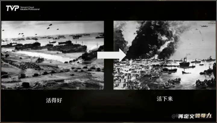 上面左图为诺曼底登陆,右图为敦刻尔克大撤退。这两张图背后所代表的含义,也正隐含了近两年互联网企业的普遍现状,从过去红利期普遍“活得好”,到现在首要追求如何“活下来”。这背后不仅仅是疫情对整个行业的影响,还有房地产、互联网金融、教育、平台电商等行业在经历过“野蛮生长”的阶段后,开始受到的监管与规范政策。在这样的背景下,大家都面临着一些新的挑战。