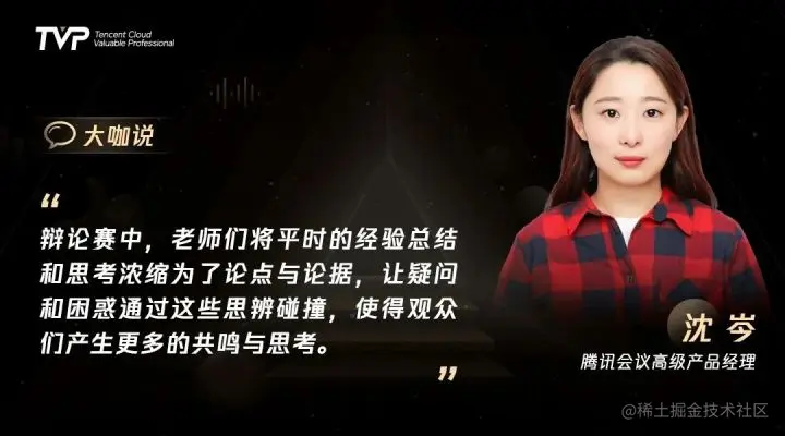 本场主持人,腾讯会议高级产品经理沈岑表示,在双方辩论的交锋中,感受到了老师们广阔的视野,开放的思维和敏锐的视角。TVP的老师们将“远程办公对团队管理更简单”与否的思辨层层拨开,结合各自多年实操总结的经验,由浅入深,坦诚而富有激情地为观众朋友们带来了一场思想的盛宴。