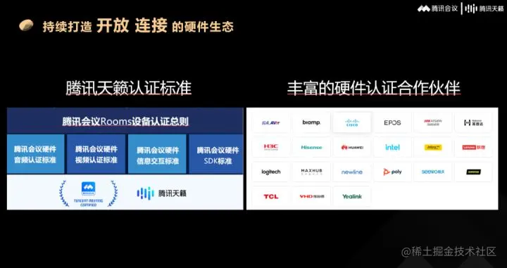 另一方面,腾讯会议持续打造开放、连接的硬件生态。目前有超过20个硬件合作品牌,超过50多个硬件产品已经通过了腾讯天籁设备认证。让腾讯会议Rooms与认证的硬件设备结合,灵活适配大、中、小、超大培训室等不同会议场景。同时,腾讯会议还会继续丰富会议室解决方案的产品形态,让企业有更多选择来利旧及升级自己个性化的会议空间。