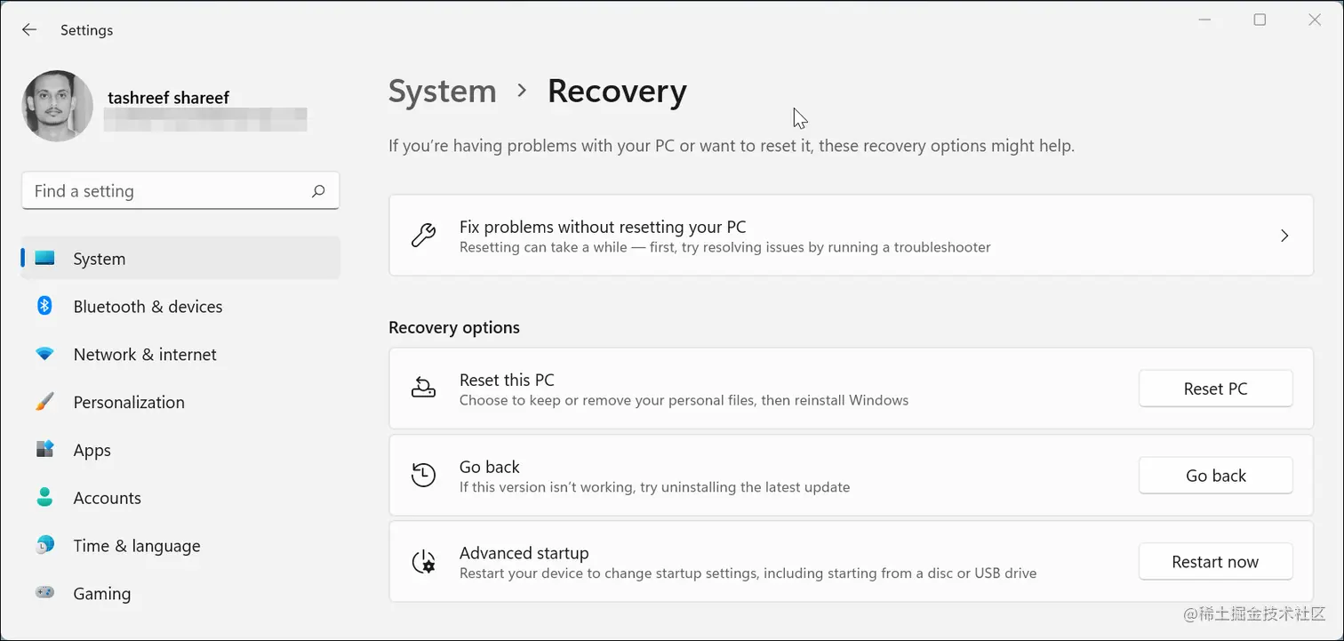 从左侧窗格中打开系统 选项卡,向下滚动并点击恢复。