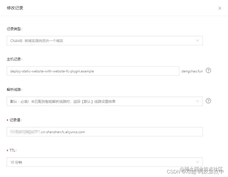 首先添加 CNAME 记录, 解析值填写 {REGION}.fc.aliyuncs.com。因为我们的 s.yaml 中设置的 region 是 cn-shenzhen, 所以对应的值就是 xxxxxx.cn-shenzhen.fc.aliyuncs.com 。