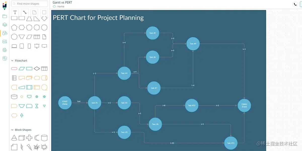 PERT图是程序评估审查技术图的缩略语。在一个二维平面上,一个类似于流程图的图形显示了从开始到结束的所有任务。