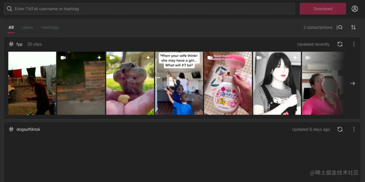 - 接下来,在搜索栏中输入TikTok用户名或标签。点击下载按钮,下载该账户的内容。
