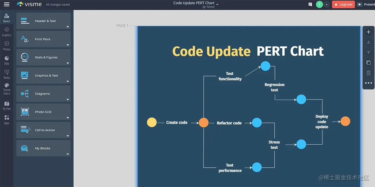 Visme是一个绘制图表和流程图的趋势性应用。它提供了一个PERT图表生成器,以方便项目管理。该工具提供了许多现代功能,如拖放创建者,连接形状和线条,以及定制几乎所有的东西。