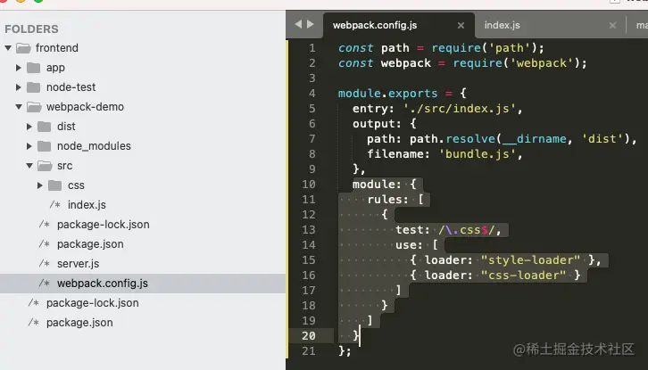 const path = require('path'); const webpack = require('webpack'); module.exports = { entry: './src/index.js', output: { path: path.resolve(__dirname, 'dist'), filename: 'bundle.js', }, module: { rules: [ { test: /\.css$/, use: [ { loader: "style-loader" }, { loader: "css-loader" } ] } ] } };