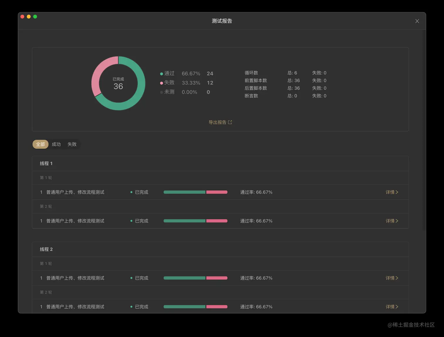 支持流程测试用例的多线程、多轮次一键执行,并且还支持套件集合所有流程进行全流程测试,报告支持导出 HTML、JSON、控制台等格式。