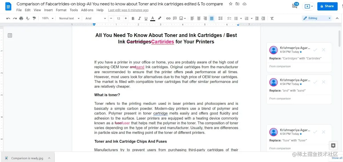 在比较两个不同的文件时,Google Docs会打开一个新的文档。这个新文件说明了两份副本中所有现有的建议编辑。它将两份Google Docs之间的差异显示为新文档中的建议编辑内容。