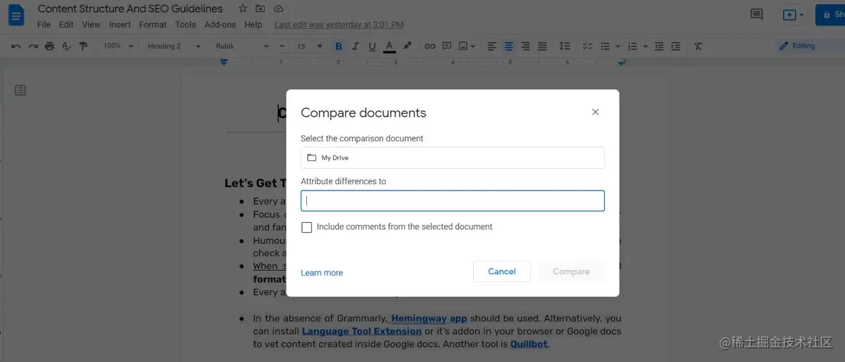 当你有两个类似的文件,但不确定两者之间的差异时,Google Docs的比较功能就派上用场了。