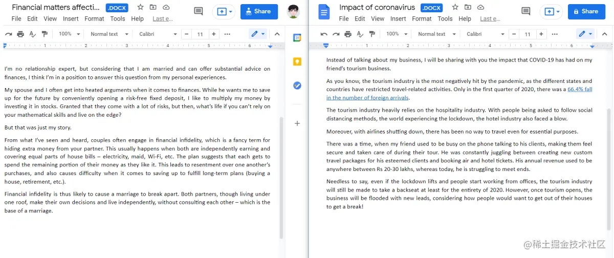 虽然Google Docs不能直接让你并排比较两个文档,但有一个方法可以解决这个问题。