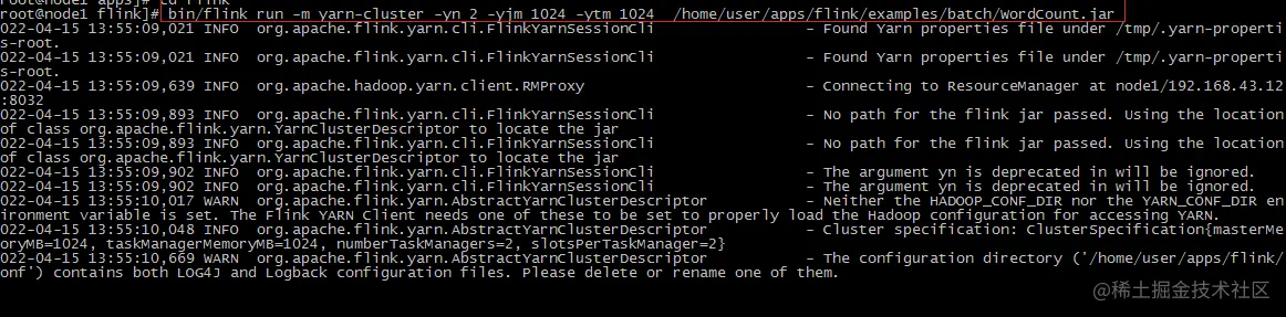 bin/flink run -m yarn-cluster -yn 2 -yjm 1024 -ytm 1024 /home/user/apps/flink/examples/batch/WordCount.jar