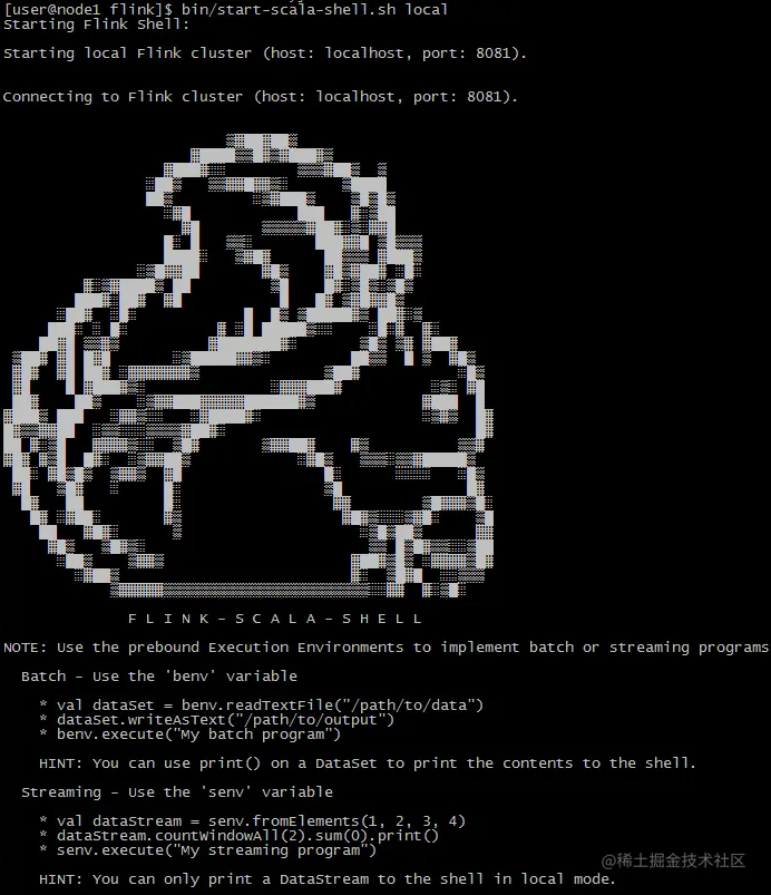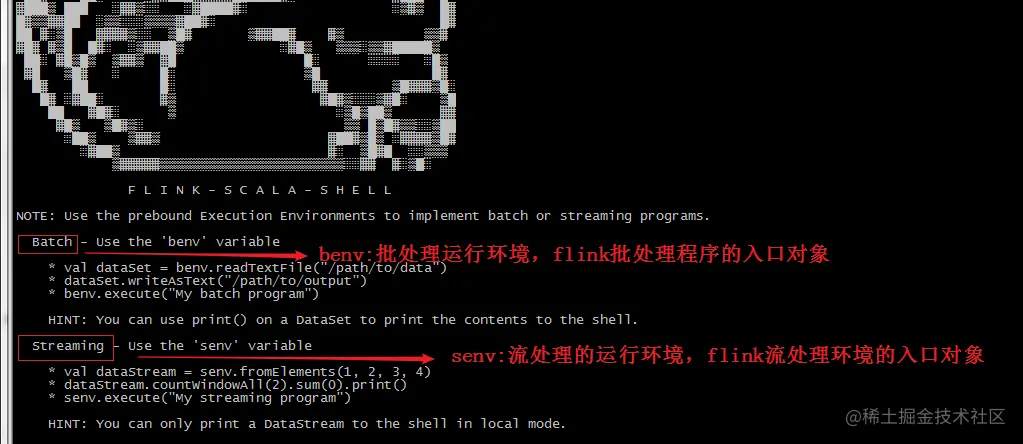 - 启动scala-shell的现象flink准备了benv,senv,分别是批处理和流处理程序入口对象