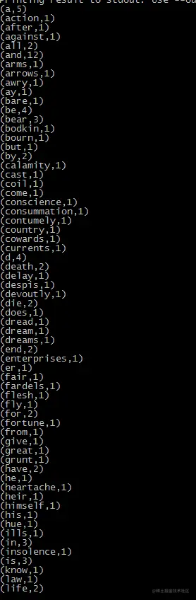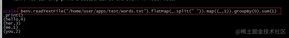 benv.readTextFile("/home/user/apps/test/words.txt").flatMap(.split(" ")).map((,1)).groupBy(0).sum(1).print()