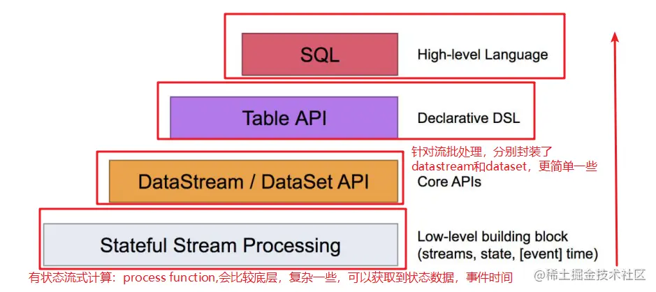除了上述这些特性之外,Flink 还是一个非常易于开发的框架,因为它拥有易于使用的分层 API,整体 API 分层如图: