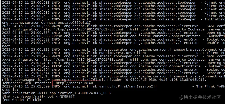 YARN Session 启动之后会给出一个 web UI 地址以及一个 YARN application ID,如下所示,用户可以通过 web UI 或者命令行两种方式提交作业。