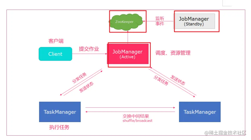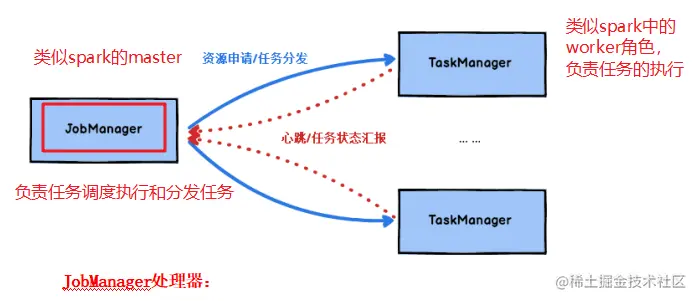 JobManager:类似spark中master,负责资源申请,任务分发,任务调度执行,checkpoint的协调执行;可以搭建HA,双master。