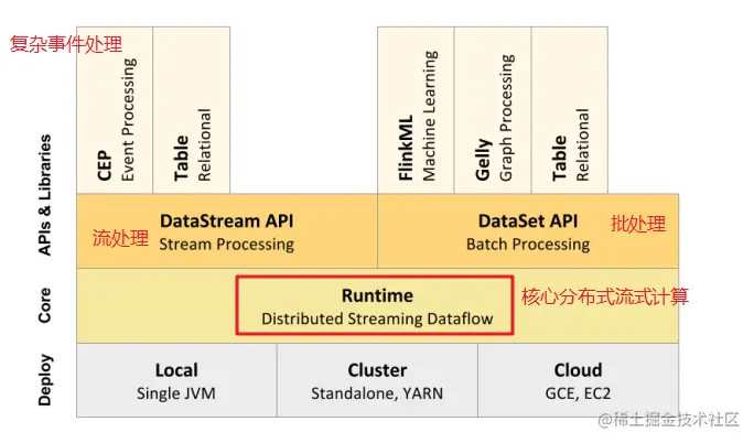 link支持的runtime(core 分布式流计算)支持的是无界数据流,但是对flink来说可以支持批处理,只是从数据流上来说把有界数据流只是无界数据流的一个特例,无界数据流只要添加上边界就是有界数据流。