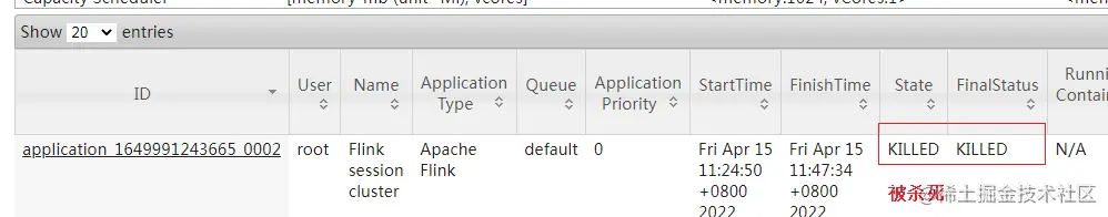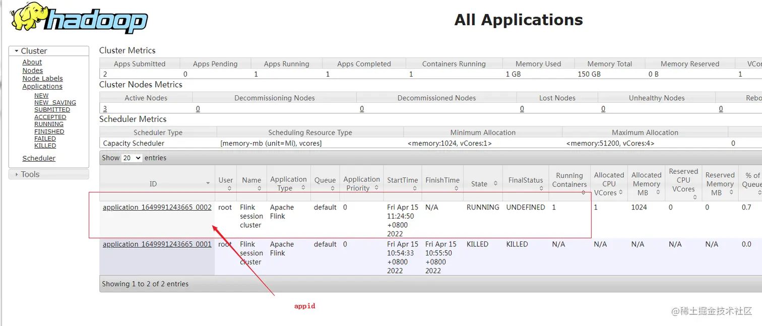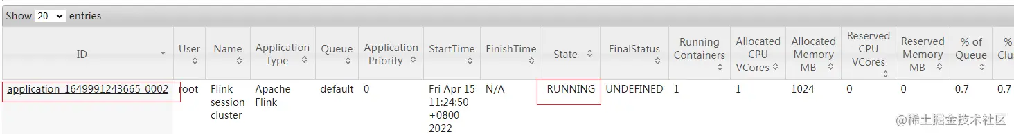 从图中可以看到我们创建的 Yarn-Session 实际上是一个 Yarn 的Application,并且有唯一的 Application ID。