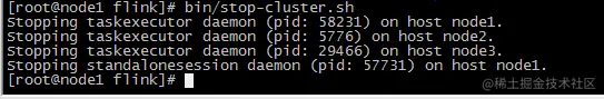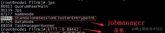 [root@node1 flink]# jps86913 QuorumPeerMain91139 Jps87177 NameNode88442 StandaloneSessionClusterEntrypoint87326 DataNode88958 TaskManagerRunner[root@node1 flink]# kill -9 88442
