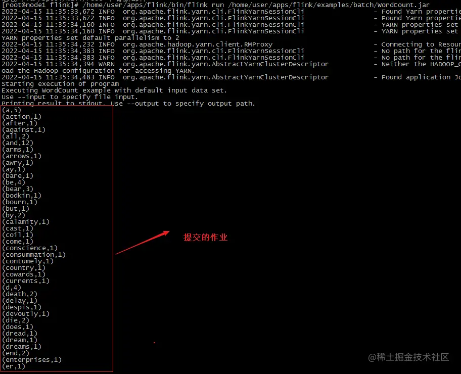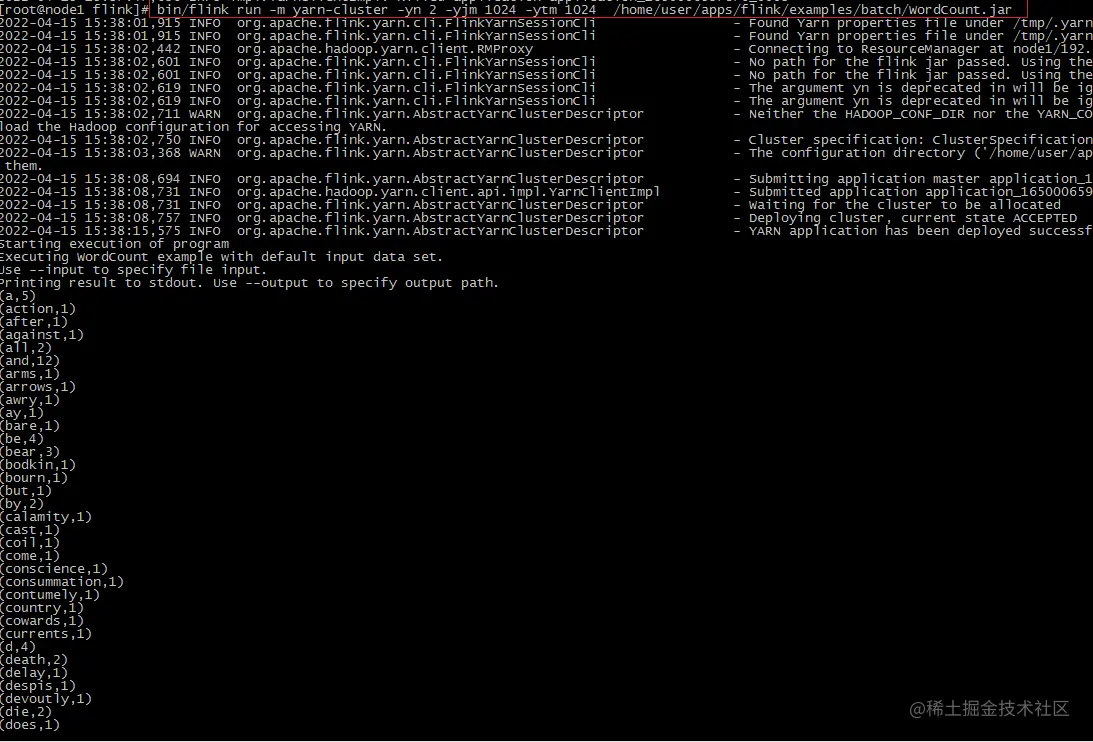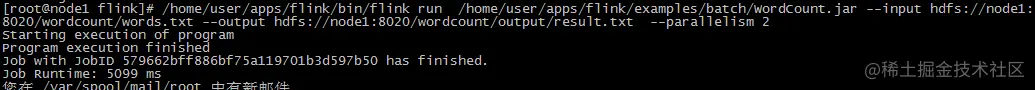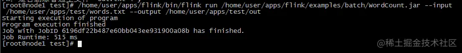 #四行代码要写在一排,其中要提前准备words.txt,WordCount.jar 自带的,out不用准备/home/user/apps/flink/bin/flink run /home/user/apps/flink/examples/batch/WordCount.jar --input /home/user/apps/test/words.txt --output /home/user/apps/test/out