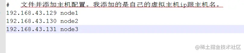 #1.在windows系统中打开 C:\Windows\System32\drivers\etc\hosts # 文件并添加主机配置。我添加的是自己的虚拟主机ip跟主机名。192.168.43.129 node1192.168.43.130 node2192.168.43.131 node3