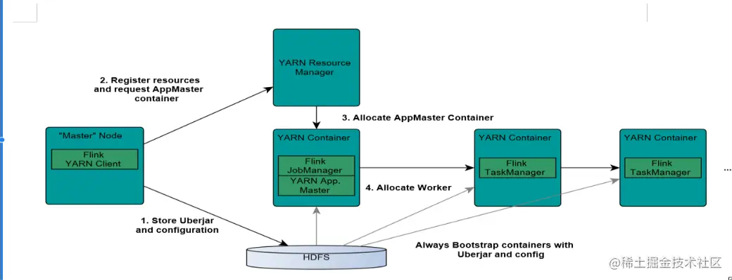 提交任务之后会在yarn集群按照我们的配置初始化一个flink集群,运行我们提交的作业,作业执行完成之后就释放资源关闭掉flink集群,把资源还给yarn集群。