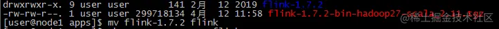 #1.解压tar -zxvf flink-1.7.2-bin-hadoop27-scala_2.11.tgz #2.改名mv flink-1.7.2 flink#3.赋予权限chown -R root:root flink