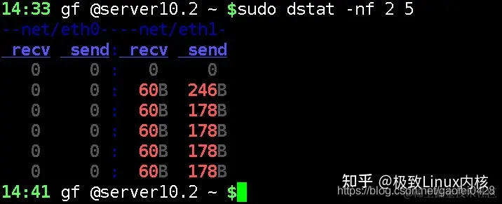 定制时间和输出间隔,比如 dstat -nf 2 5 表示输出网络设备 2秒一次 一共输出5次