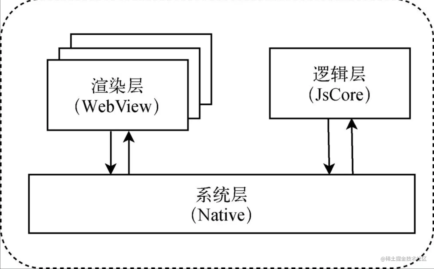 通过 JSBridge 构建 JS 和 Native 之间的通信,以便上层间接调用客户端的原生底层接口;提供网络请求、数据缓存、本地文件、媒体等基础能力;为逻辑层与渲染层的通信做中转。