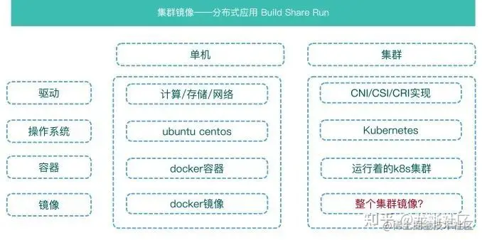- 单机上有虚拟机镜像,docker 镜像;随着云计算技术的发展,集群上也会抽象出类似的镜像技术。