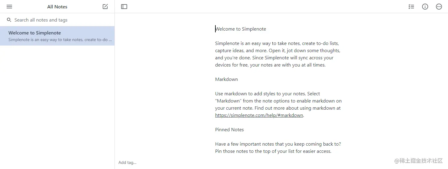 列表中的下一个是Simplenote。该平台的用户界面很简洁,而且容易理解。左边是你所有的笔记。右边占据了大部分屏幕的是你的文本编辑器。
