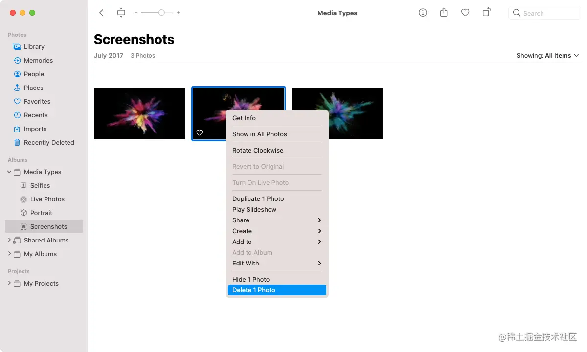 首先,在 "照片 "侧边栏扩大媒体类型。然后选择一个类别(如截图),选择你想删除的图像,并选择删除照片或删除照片。