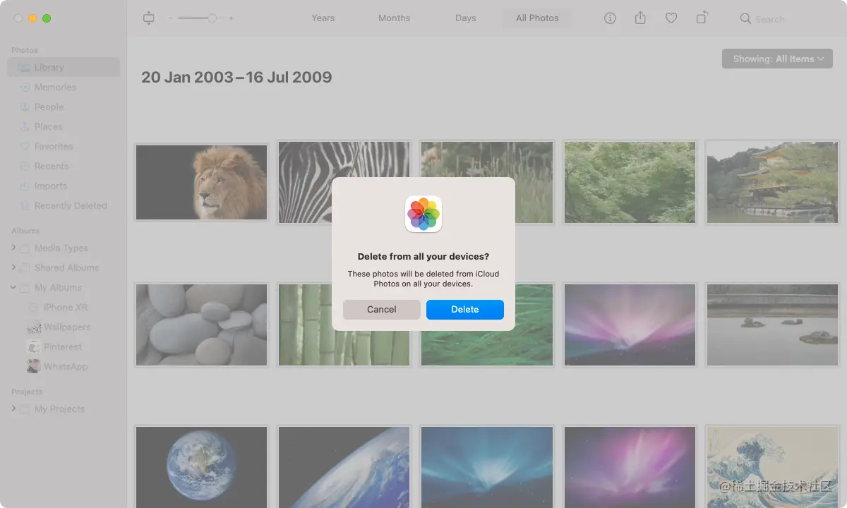 Mac的照片应用程序允许你在滚动浏览照片库时删除图片。要做到这一点,在**"资料库">"所有照片**"下**,用鼠标控制点击照片缩略图,然后选择删除照片。如果你使用iCloud照片,选择删除** 以确认你想从其他苹果设备中删除照片。