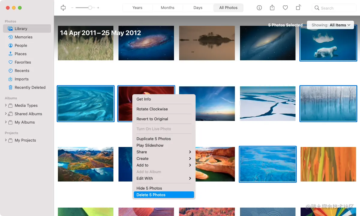 同样,你可以在照片应用程序中删除整个资料库。如果你启用了iCloud照片,只需记住,这将导致你在每台苹果设备上失去你的图像如果你仍然想继续下去,选择图书馆>所有照片,然后按Cmd**+ A.然后,控制点击任何缩略图,选择删除照片**选项。