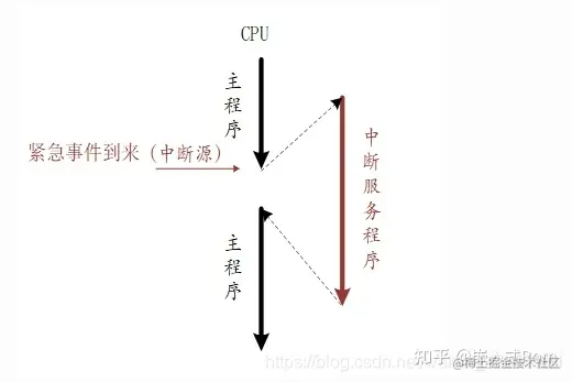 当 CPU 正在处理内部数据时,外界发生了紧急情况,要求 CPU 暂停当前的工作转去处理这个 异步事件。处理完毕后,再回到原来被中断的地址,继续原来的工作,这样的过程称为中断。实现这一功能的系统称为 中断系统,申请 CPU 中断的请求源称为 中断源。中断是一种异常,异常是导致处理器脱离正常运行转向执行特殊代码的任何事件,如果不及时进行处理,轻则系统出错,重则会导致系统毁灭性地瘫痪。如下图是一个简单的中断示意图。