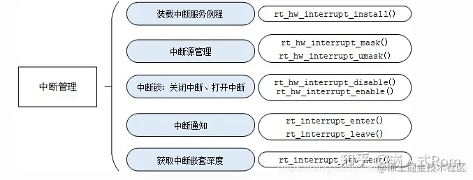 为了把操作系统和系统底层的异常、中断硬件隔离开来,RT-Thread 把中断和异常封装为一组抽象接口,如下图所示: