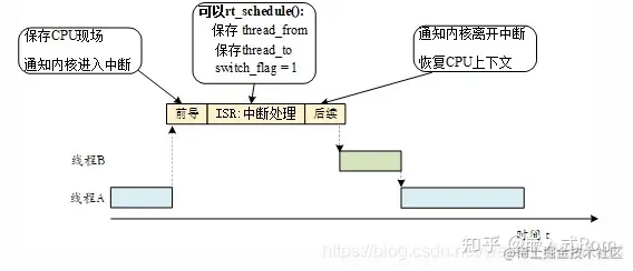 RT-Thread 中断管理中,将中断处理程序分为中断前导程序、用户中断服务程序、中断后续程序三部分,如下图:
