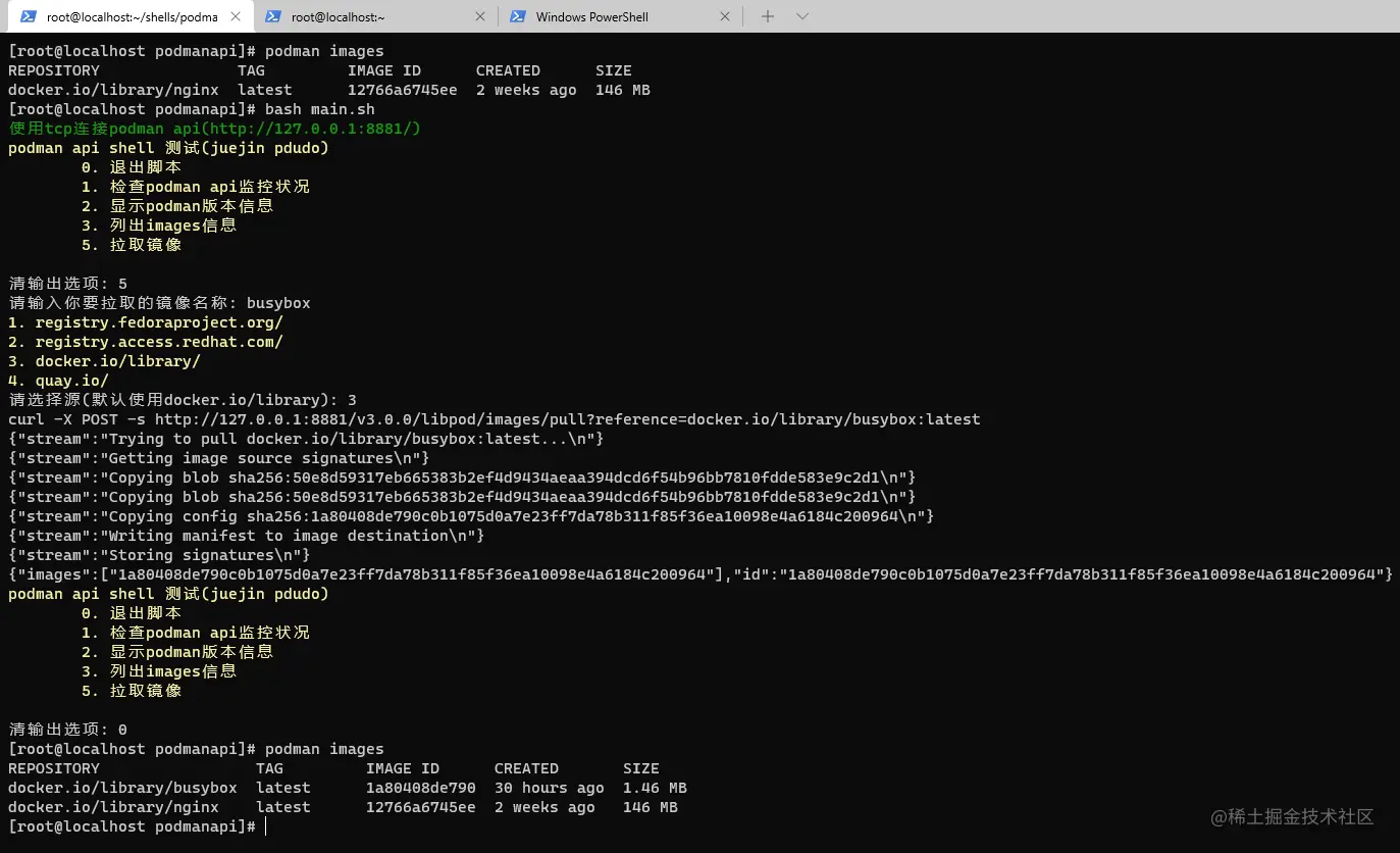 拉取镜像路由为: /v3.0.0/libpod/images/pull?reference=镜像名称,所以我们根据该命令写出镜像拉取脚本