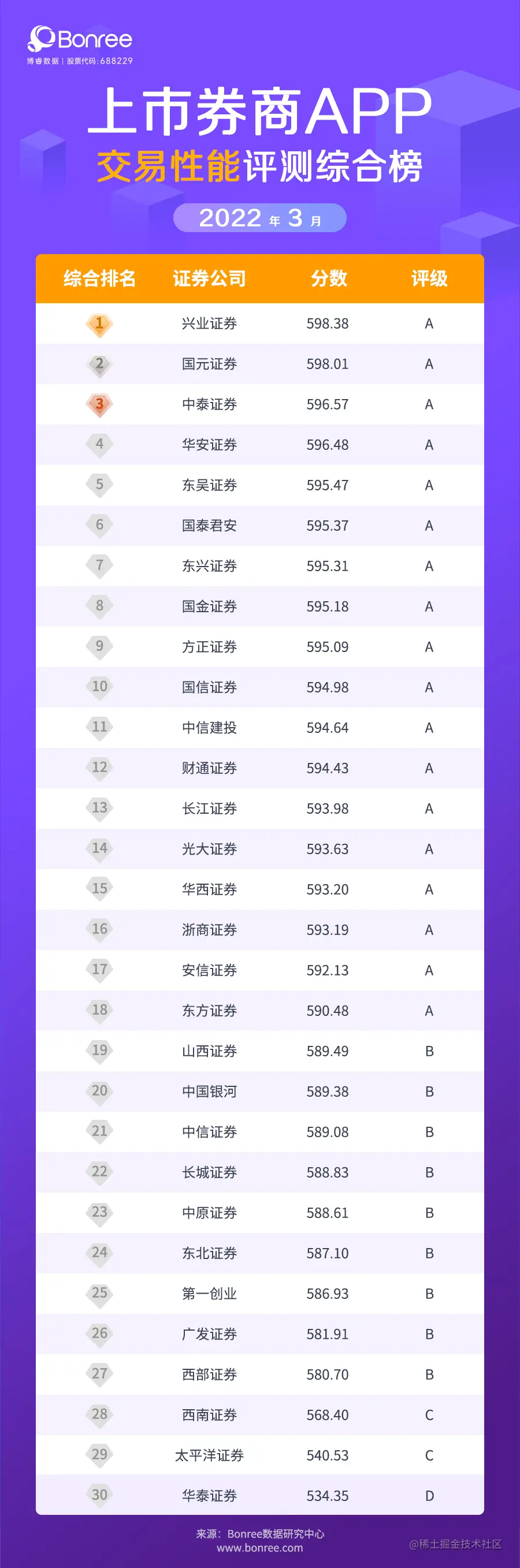 在2022年3月上市券商App交易性能综合评测中,兴业证券再登榜首,国元证券及中泰证券位列第二、第三名。此外,本月A级券商共计18家,较上月增加2家,B级券商9家,C级券商2家,D级券商1家。