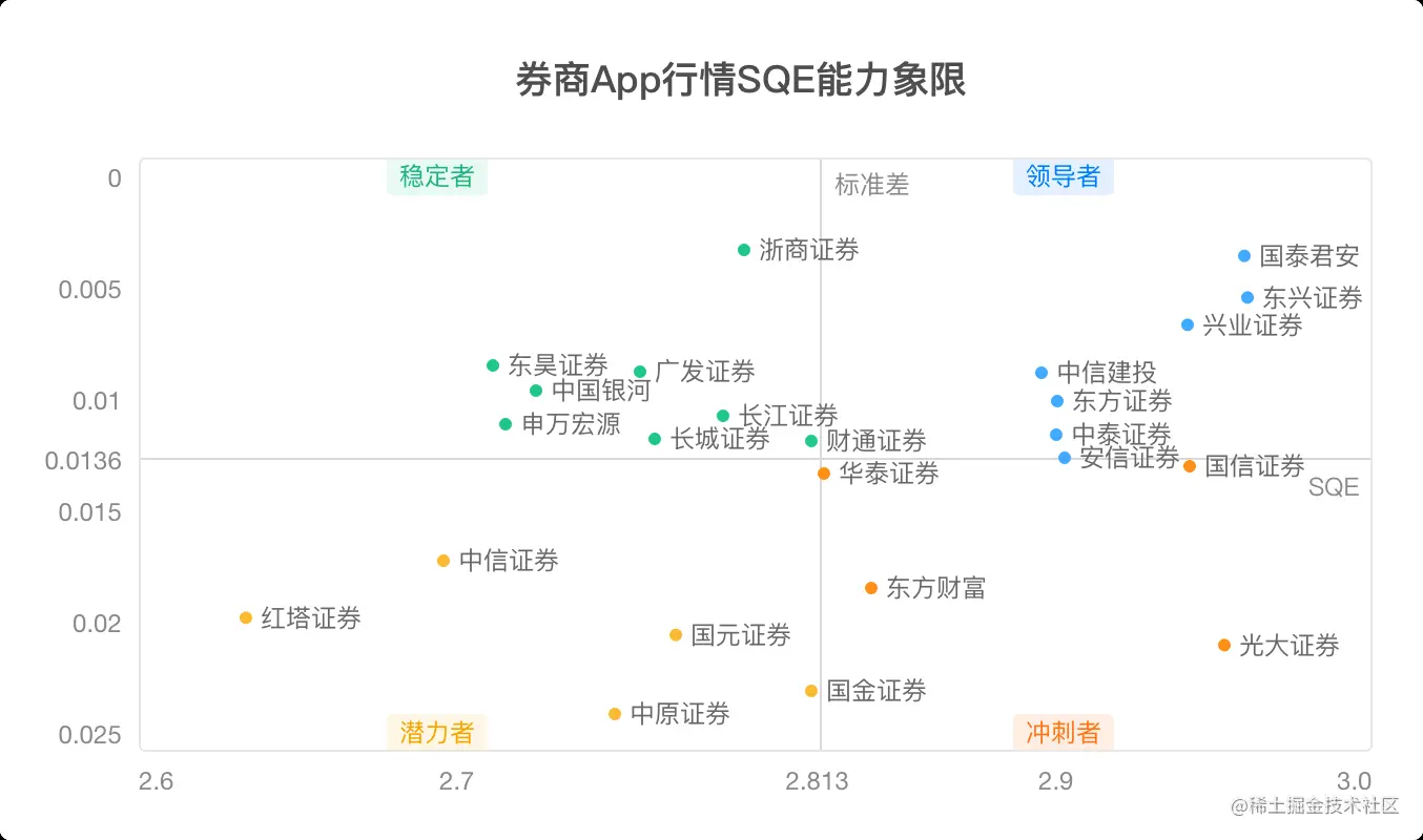 为了帮助用户充分利用《券商App行情刷新及交易体验评测报告》,提升用户体验,自2022年1月起,我们新增了券商App行情SQE能力象限,从性能和效率问题出发,将原有单一的SQE标准,调整为(SQE,标准差)二维指标,相较于以往的券商排名及评级,券商App行情SQE能力象限将各券商以更全面和更直观的方式呈现出来,帮助用户更直观的了解各券商的稳定情况。同时,新增上市券商App行情SQE象限指标,上市券商App交易性能评测综合榜依然保留。