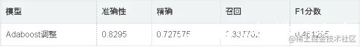 因此,我们已经看到,调整后的Adaboost的准确性约为82.95%,并且在所有其他性能指标(例如F1分数,Precision,ROC和Recall)中也取得了不错的成绩。