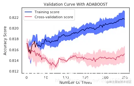 在最大树数为250的情况下,由于训练得分为0.82但验证得分约为0.81,因此模型存在高方差。换句话说,模型过度拟合。同样,数据点显示出一种优美的曲线。但是,我们的模型使用非常复杂的曲线来尽可能接近每个数据点。因此,具有高方差的模型具有非常低的偏差,因为它几乎没有假设数据。实际上,它对数据的适应性太大。