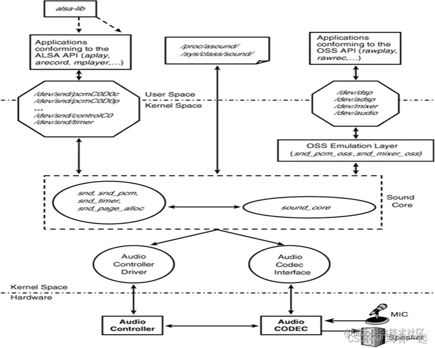 在声卡的驱动中一种是OSS:open sound system(开放声音系统),一种是ALSA: Advanced Linux Sound Architecture(先进Linux声音架构)。OSS是一个商业声卡驱动程序,需要花钱购买。一般我们现在使用的是ALSA的声音架构,ALSA包括对声卡的支持和驱动。嵌入式微控制器/DSP中集成了PCM(脉冲编码调制接口)、IIS或者AC97音频接口。通过这些接口外部的音频解码器可以实现声音的AD和DA转换。