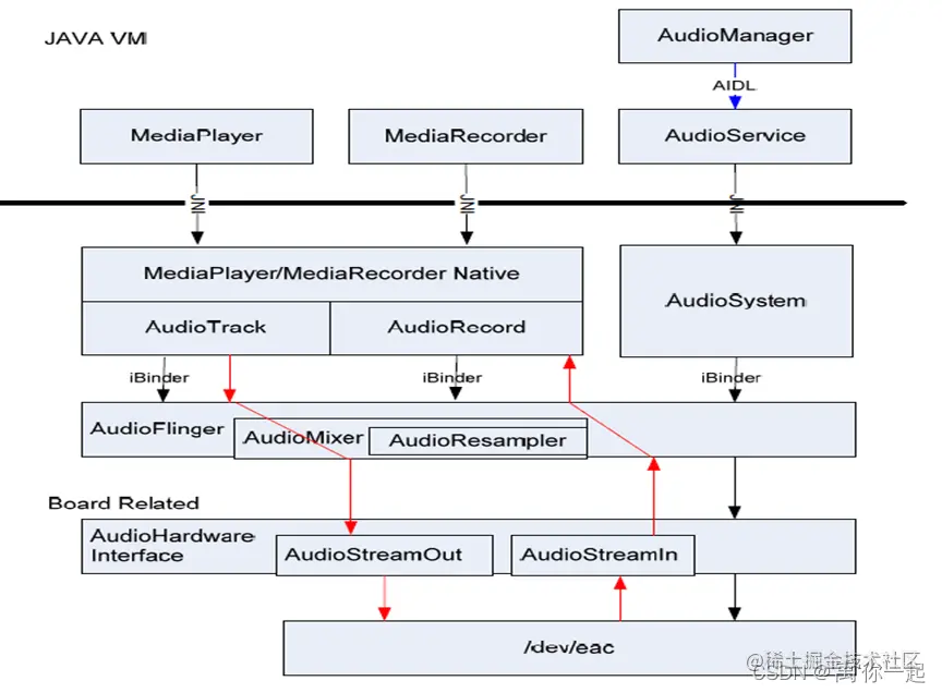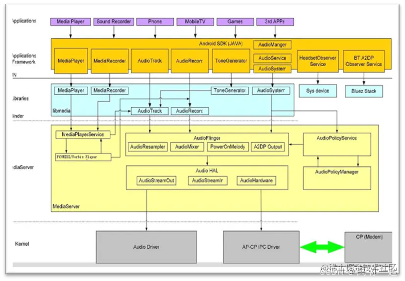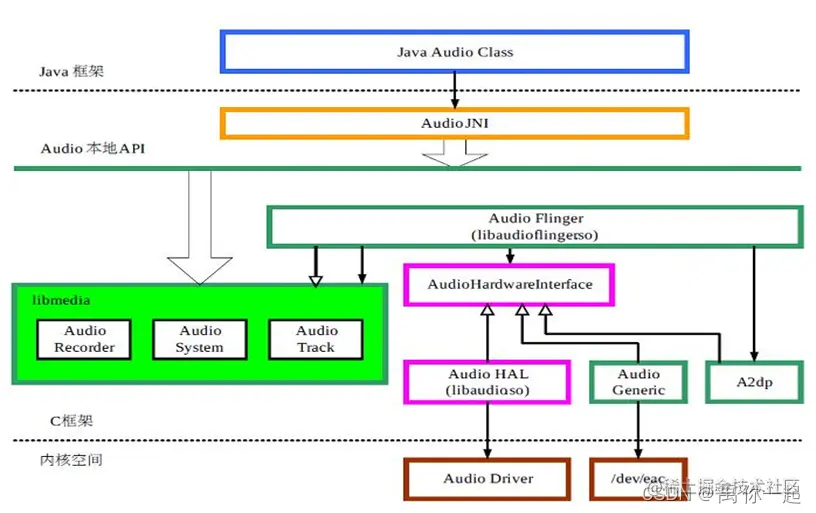 Android的Audio系统从上层应用到底层驱动大致可以分为Audio的JAVA层, JNI层,框架层, Flinger层, HAL层以及Kernel层。