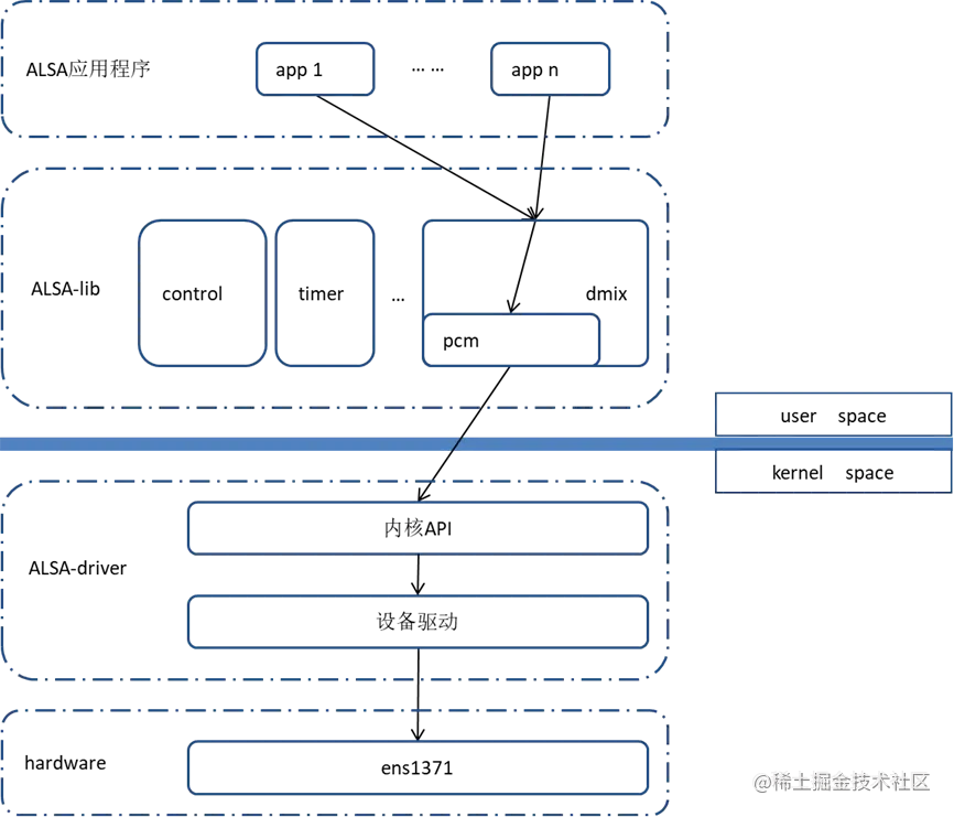 alsa-lib是用户空间的函数库,提供了libasound.so给应用程序使用,应用程序应包含头文件asoundlib.h。这个库通过提供封装函数(ALSA-API),使ALSA应用程序不需要涉及具体硬件,编写起来更容易。alsa-lib中有control,timer,dmix,pcm等,都是以插件(plugin)的形式存在的。alsa-lib通过硬件访问层的系统调用与内核层进行交互。