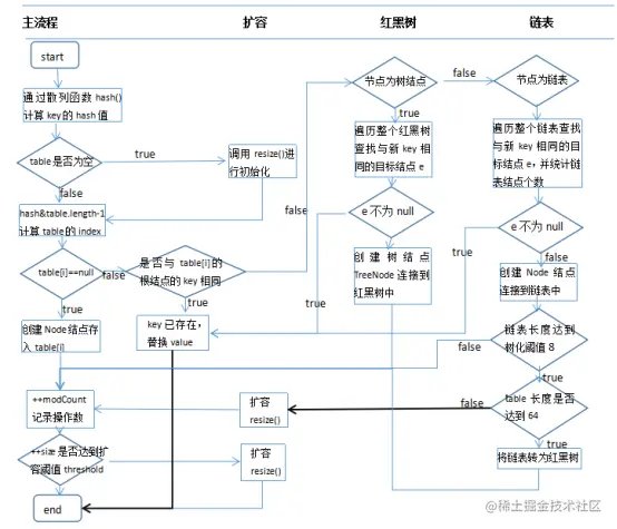 c) 如果table[index]的根结点的key与新的key“不相同”,并且table[index]不是一个TreeNode结点,说明table[index]下是一个链表,如果该链表中的某个结点的key与新的key“相同”,那么用e记录这个相同的结点,否则将新的映射关系封装为一个Node结点直接链接到链表尾部,并且判断table[index]下结点个数达到TREEIFY_THRESHOLD(8)个,如果table[index]下结点个数已经达到,那么再判断table.length是否达到MIN_TREEIFY_CAPACITY(64),如果没达到,那么先扩容,扩容会导致所有元素重新计算index,并调整位置,如果table[index]下结点个数已经达到TREEIFY_THRESHOLD(8)个并table.length也已经达到MIN_TREEIFY_CAPACITY(64),那么会将该链表转成一棵自平衡的红黑树。